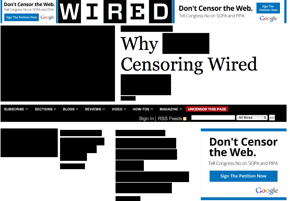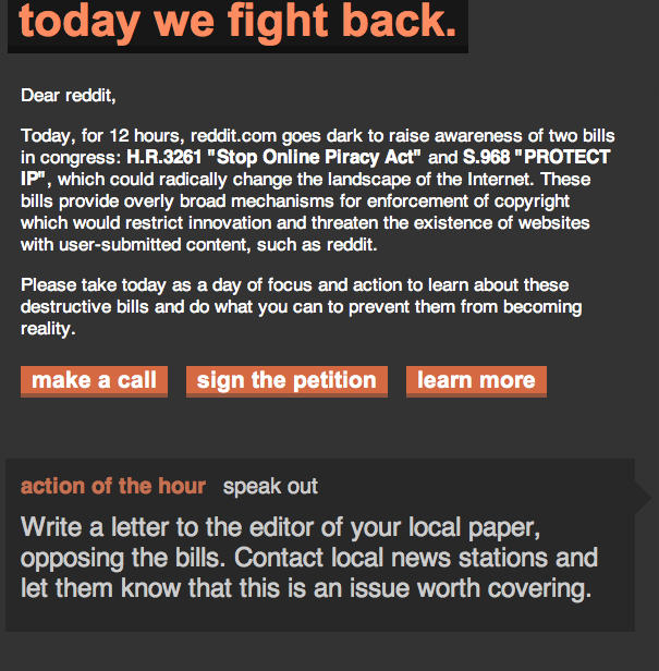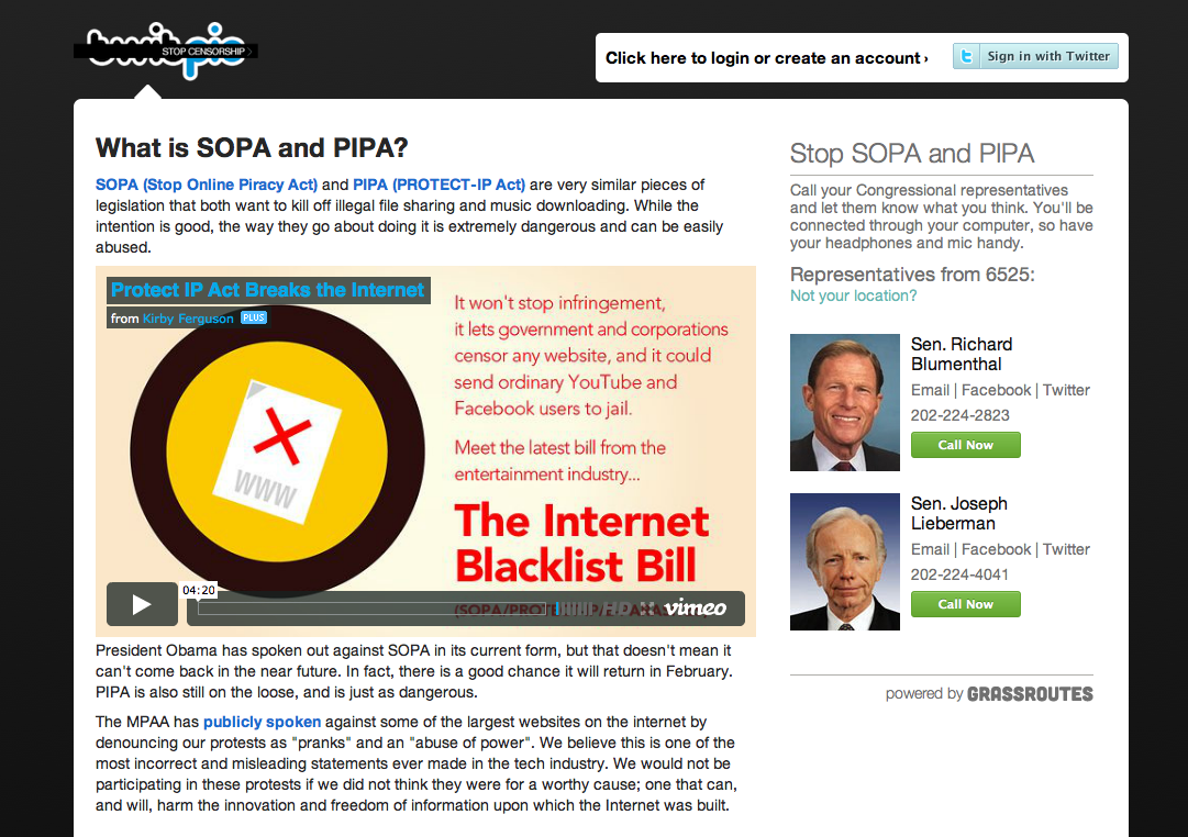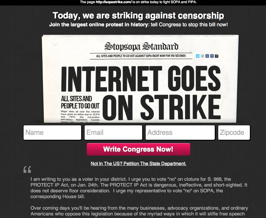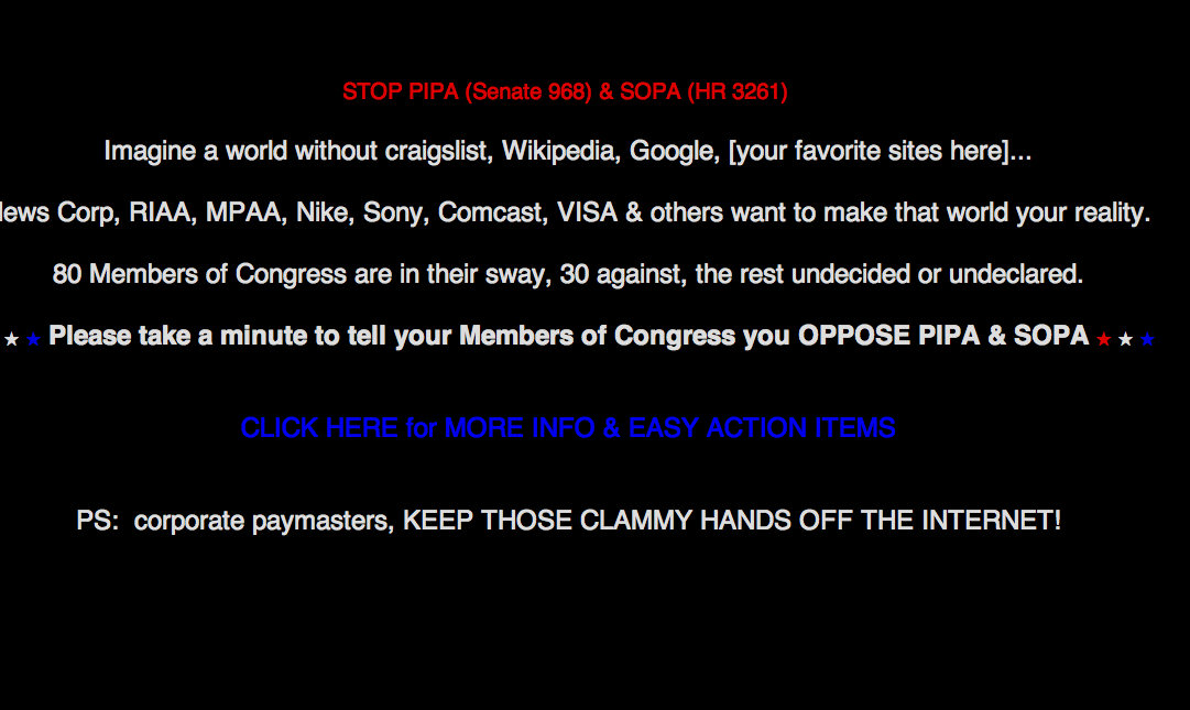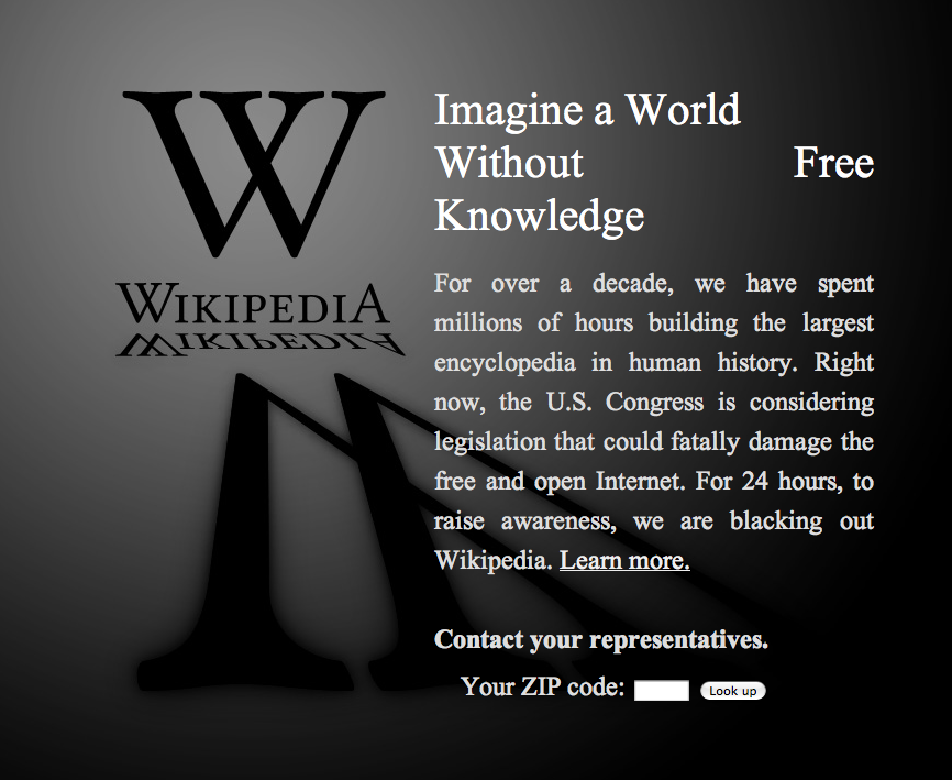 Wikipedia, Craigslist, WordPress y otras de las páginas más visitadas de internet comenzaron el 18 de enero una suspensión de servicio de 24 horas para protestar dos medidas que en la actualidad se discuten en el Congreso de EUA, medidas que de aprobarse impondrían serias restricciones en los fundamentos de internet: la libertad de expresión.