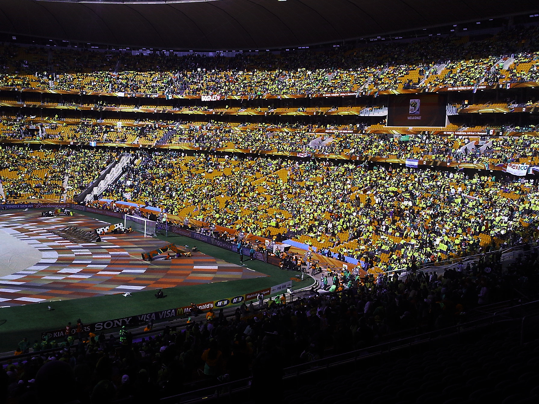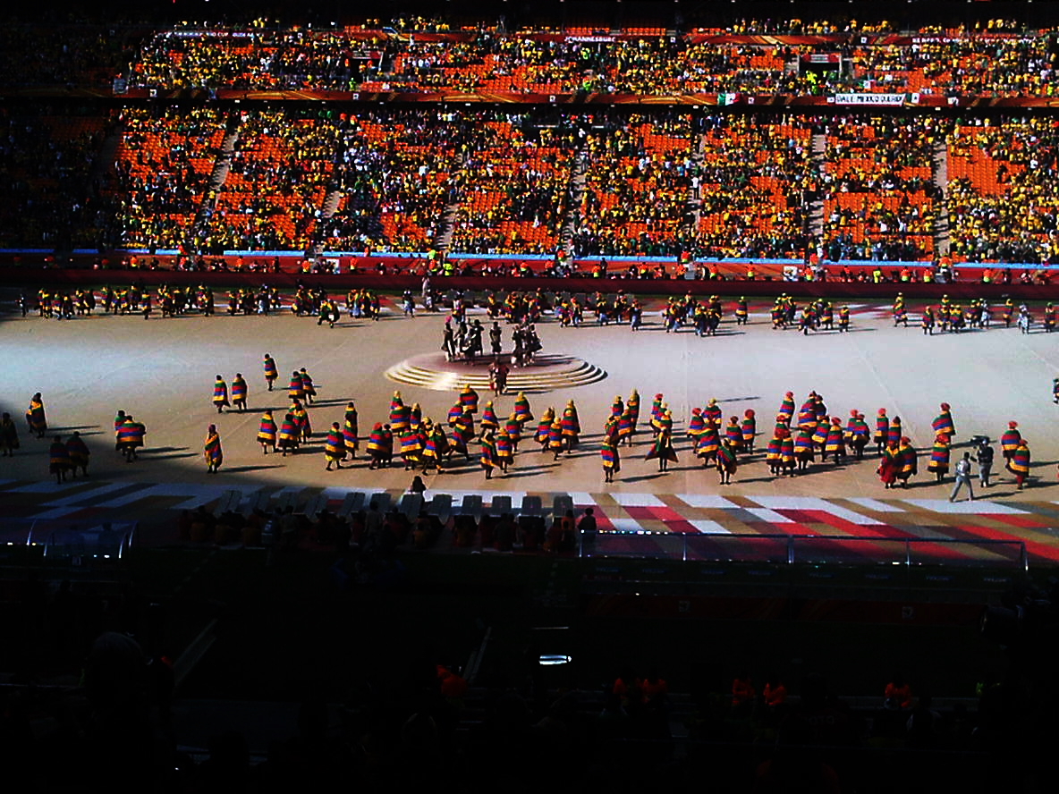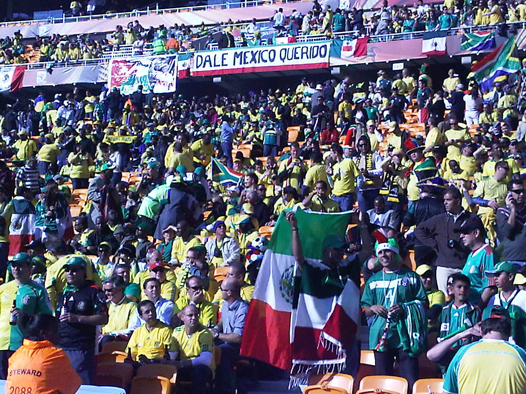 10:45 am EST. Terminó un primer tiempo donde Sudáfrica jugo solo los últimos diez minutos. Mexico ataca más y tocó mejor. Quizás fue por la cantidad de Mexicanos presentes que se hicieron oir con su himno nacional a la misma altura que los locales. Veremos qué pasa en el segundo tiempo. Pero las vuvucelas no han dejado de sonar y. Desmond Tutu no ha dejado de bailar en su tribuna. Aquí también está Pelé a quien vimos firmando un autógrafo a la nieta de Joe Biden. Hablando de estadounidenses aquí hemos visto a uno que otro exagerados usando tapones en los oídos….¡hágame el favor!