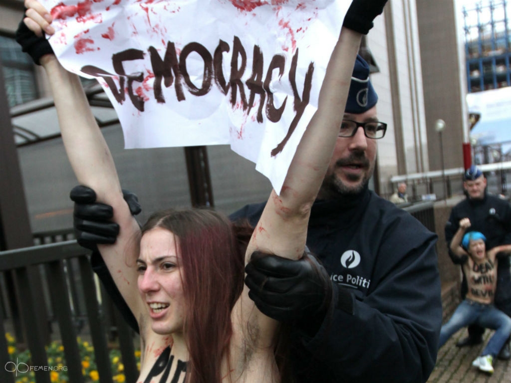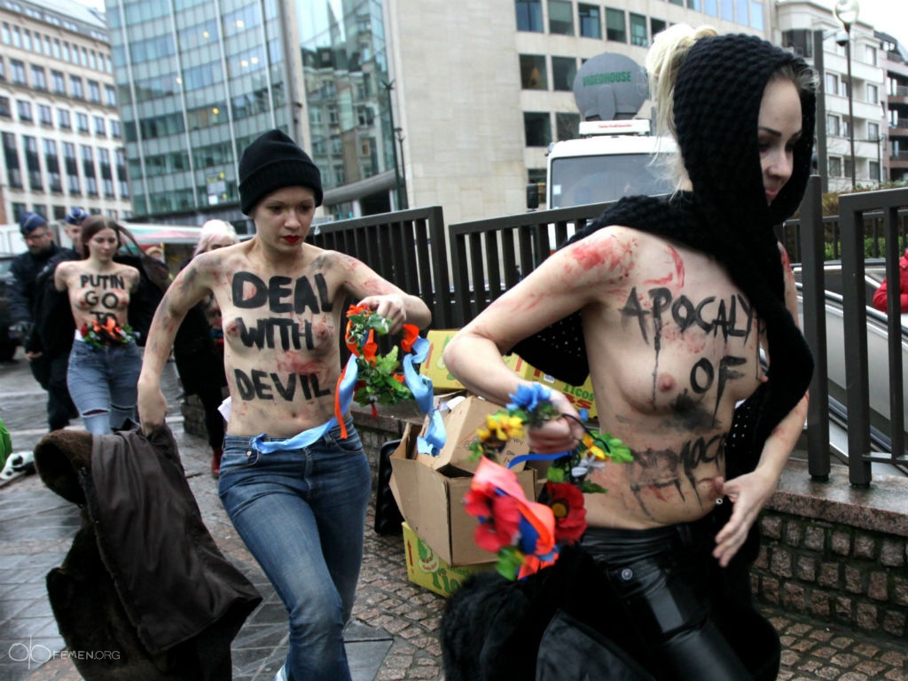 Según una declaración en su página web, FEMEN pide “Expulsar de la capital de la Unión Europea al enano apocalíptico Putin y advierte sobre los desastres que para la democracia representa el contacto cercano con los monstruos del Kremlin”.
