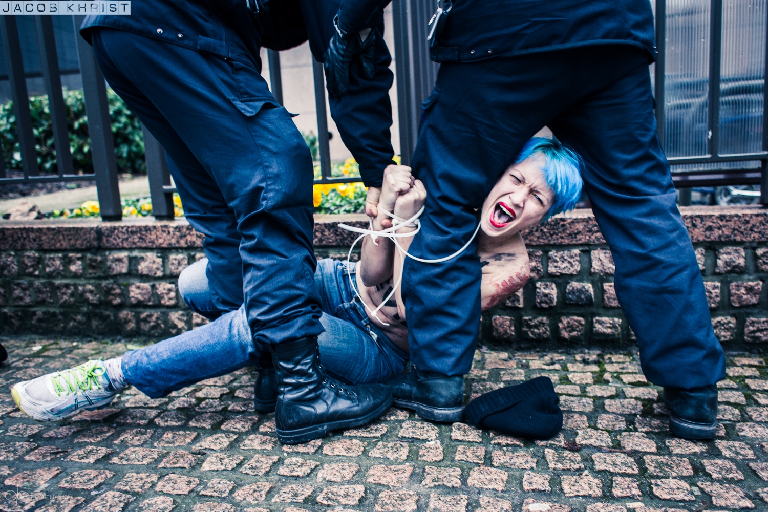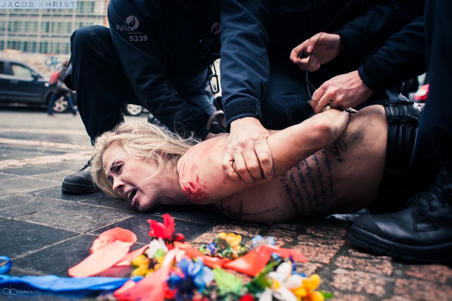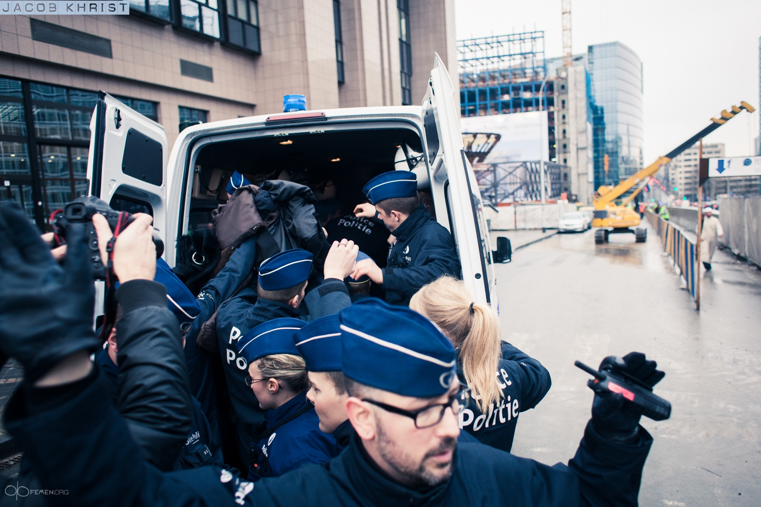 Como puede verse de las fotos, la policía en Bruselas detuvo a las activistas.