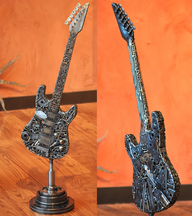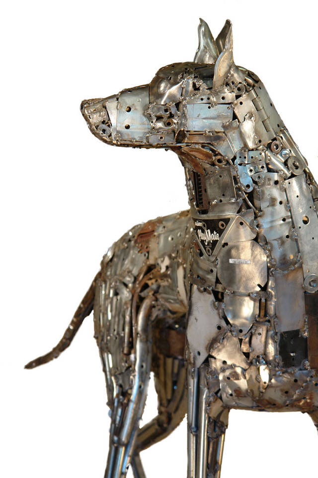No solo las esculturas de Brian Mock son imponentes, sus materiales le dan una dimensión única: son tuercas, tornillos, bisagras, cubiertos y cientos objetos que él ha encontrado y mediante su magia de la soldadura convertido en aves, perros, incluso guitarras eléctricas Gibson.
