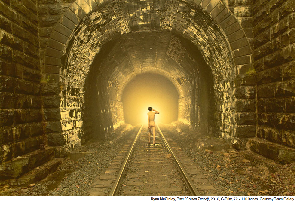 Contrasta por su sublimidad, la fotografía (Túnel de Oro) de Tom Ryan McGinley, 2010: una imagen surreal cinematográfica de una figura masculina desnuda en un túnel de tren.