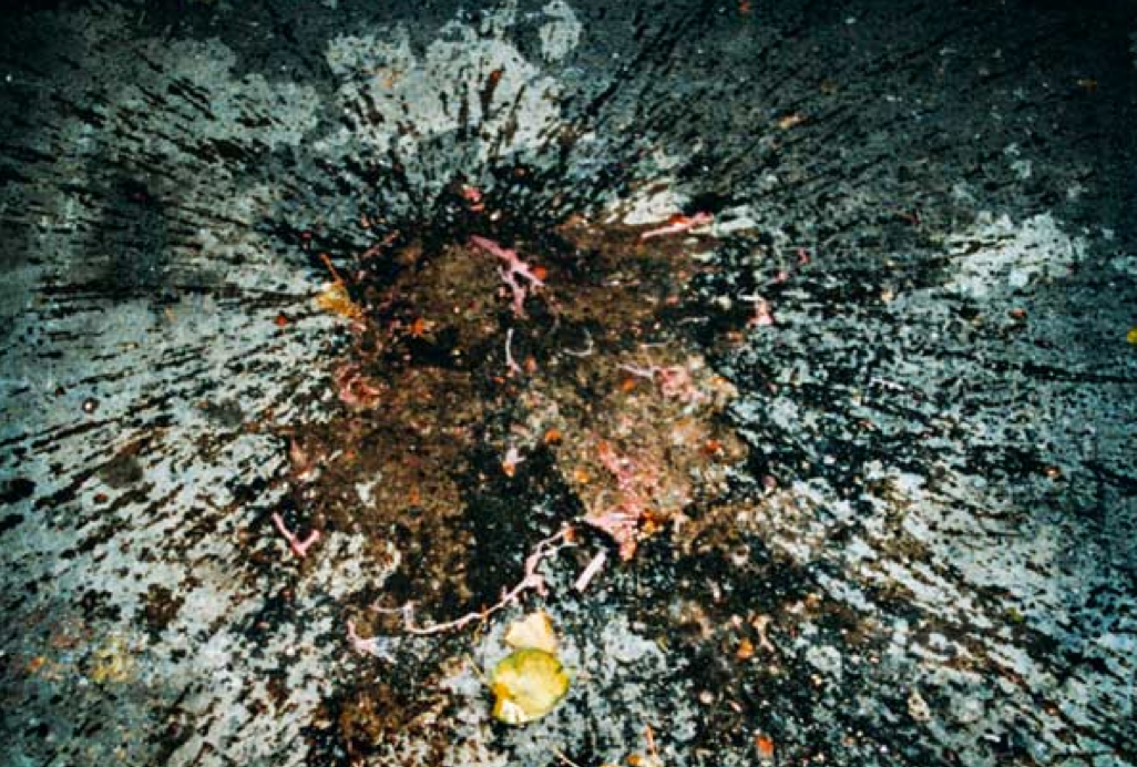 Por ejemplo, Blop!, una pieza de bidimensional de Dan Colen, fabricada en alquitrán y plumas adheridas a la lona, parece caótica y lamentable — por su referencia al acto bárbaro y arcaico del castigo social.
