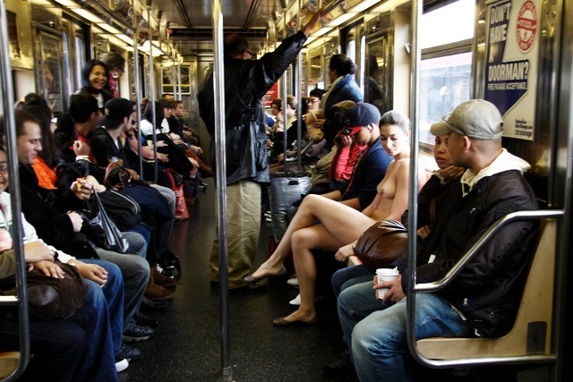 Simone monta el metro, denuda; sale de compras, desnuda; pasea en motocicleta, desnuda; pide limosna, desnuda; palea nieve, desnuda. Y desnuda posa con obreros de la construcción y empleados de estacionamientos. En fin, hace lo mismo que hacen a diario millones de neoyorkinos, solo que tal cual el mundo la recibió.