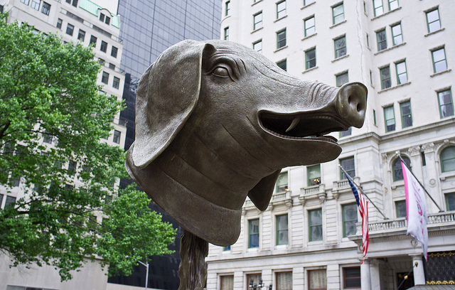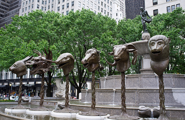 Igualmente nos llamó la atención serie de fotos de dos instalaciones en New York. Círculo de Animales / Cabezas de Zodiaco, del artista chino Ai Wiewi, en torno a la fuente Pulitzer en Grand Army Plaza en New York (5ta Avenida con 59). Dice que el artista Ai Weiwei no ha podido ver su obra en la Gran Manzana porque se encuentra detenido por el gobierno chino.